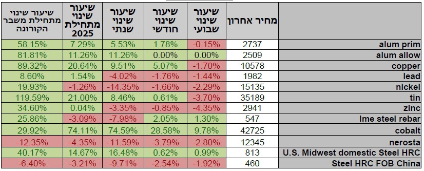 טבלת מחירי מתכות