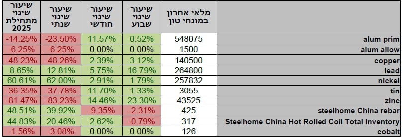 מדדי תובלה ימית, אבץ, בדיל, ניקל, עופרת, אלומיניום (PRIM), אלומיניום (ALLOY), קובלט, נחושת, פלדה, פלדה (REBAR), נירוסטה, ליתיום ודלק גולמי