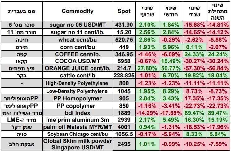 סוכר מס'5, סוכר מס' 11, קקאו, קפה, תירס, חיטה, סויה, אבקת חלב, שמן דקל, מיץ תפוזים ומדדי מחירי התובלה