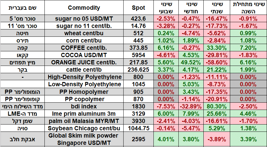 סוכר מס'5, סוכר מס' 11, קקאו, קפה, תירס, חיטה, סויה, אבקת חלב, שמן דקל, מיץ תפוזים ומדדי מחירי התובלה